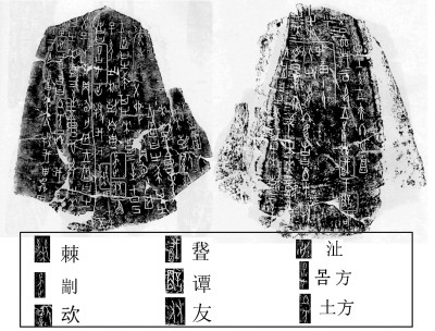 由此可知,与祊地相关的地名已有滳、盂、[字⑥]、宫、向、丧、斿等7个。其中滳与盂就在祊的附近,田猎点的对贞选卜与田猎诹日习俗,则决定了[字⑥]地以下的5个地名也应该团簇在祊地周边,由此形成了一个涉及晚商田猎区的核心地名组。经由与《春秋》经传等文献的比对可知:滳水即汶水下游鄣邑附近的某河流,与冀豫界河“漳河”无关;盂地则在泰山南麓,即《左传》定公十四年“蒯聩献盂于齐”的盂地,卜辞习见之“盂方”即为东土盂地之邦,非各式历史地图所标注的西北部族;向即《春秋》襄公二十年“仲孙速会莒人,盟于向”之向,地处鲁、莒间;丧地或与《左传》昭公二十年所记爽鸠氏有关。至于宫与斿的坐落方位,亦有相应的铜器出土地等线索可资利用。