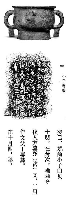 德国某藏家所收藏的“小子[字⑤]簋”(《集成》4138)为商末器,有铭文5行,字数大致有34或35字。由于锈蚀等原因,有几处文字模糊不清,学者的释读颇多分歧。但经认真辨析后可知,赏赐地在“冓次”,征伐对象为“人方”的[字⑤]与祊,而从文字间距判断,可能存在第三个征讨对象,可惜文字已被铜锈完全掩盖。至于“小子”后所缀名讳用字,虽已漫漶,但一定不是“[字⑤]”字。由此可以断定,过去以“小子[字⑤]簋”命名该器物是错误的。更重要的是,由于地名族名用字“冓”“祊”的辨识,不仅铭文基本可以通读,其史料价值也有了显著提升:首先,“人方”并非特定的邦国,其内涵如同金文所见的“南夷”“淮夷”“南淮夷”,为区域名;其次,[字⑤]与祊均为“人方”区域内的方国名,具体地望应该在山东境内寻找;从考古材料判断,晚商举族族居地大致在今济南平阴一带,所以作为赏赐地“冓”,同样在东方的可能性更大些。当然祊属人方部族这一信息最为重要,对旧说的纠错及重建晚商政治地理体系意义重大。