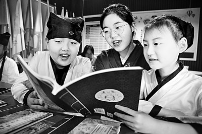 江苏省镇江市和平路街道新金江社区公益课堂,身着汉服的小朋友在读唐诗。石玉成摄/光明图片