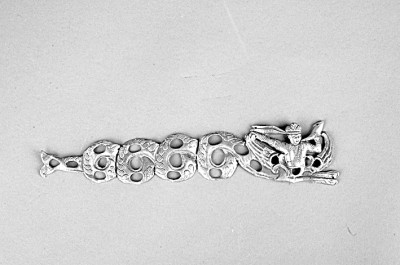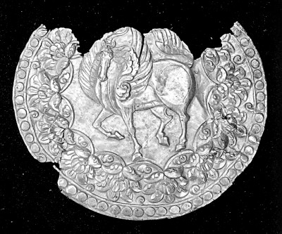 金饰片一般用于服饰或马具上,还有一件金饰片的人物盘腿坐在兽头带腿矮榻上,束发戴冠,三角形翻领窄袖胡袍,袍边缝饰花纹,同时结合了草原游牧民族和中亚民族的服饰特征,生动反映了吐谷浑贵族的形象,应当是东西方文化交流过程中产生的互动艺术品。与其他草原游牧民族一样,吐谷浑人和吐蕃人都对马、牛、羊鹿等各种动物纹饰十分偏爱。这些动物形象常常作为最显著的主纹出现在金银饰片的图案中,它们或昂首挺立或扬蹄奔腾,雄健威武,形象生动鲜活,充满着灵动感。尤其值得注意的是,工匠们还在这些动物原型的基础之上,对其进行了大胆的艺术夸张,在许多动物的肩部装饰以粗短的双层或多层羽翼,成为传说中的翼马、翼羊等“有翼神兽”,一度流行于欧亚草原文化,“青海道”金银器中的有翼神兽可能就是受其影响。