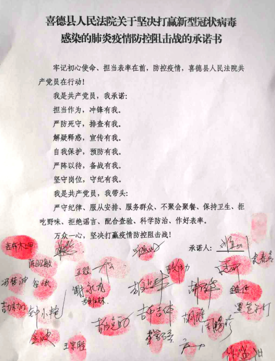 “我是共产党员,我承诺:担当作为,冲锋有我;严防死守,排查有我;解疑释惑,宣传有我;自我保护,预防有我;严阵以待,备战有我;坚守岗位,守纪有我。我是共产党员,我带头严守纪律、服从安排、服务群众、不聚会聚餐、保持卫生、拒吃野味、拒绝谣言、配合查验、科学防治、牢记初心使命、担当表率在前,做好表率,万众一心,解决打赢疫情防控阻击战!”这是喜德法院所有党员干警在刘勇刚的率领下集体向组织作出的庄严承诺!一个个鲜活的名字,一个个鲜艳的红手印,是共产党人的初心和使命。它不仅是冲锋在前的承诺书,还是新冠肺炎战疫战场的“请战书”,更是全国法院人在战役前线的一个小小缩影。