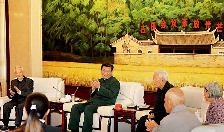 2014年10月31日,中共中央总书记、国家主席、中央军委主席习近平专程来到福建省上杭县古田镇,出席正在这里召开的全军政治工作会议。这是10月31日,习近平接见老红军、军烈属和“五老”同志代表(新华社记者 李刚 摄,图片来源:人民日报)